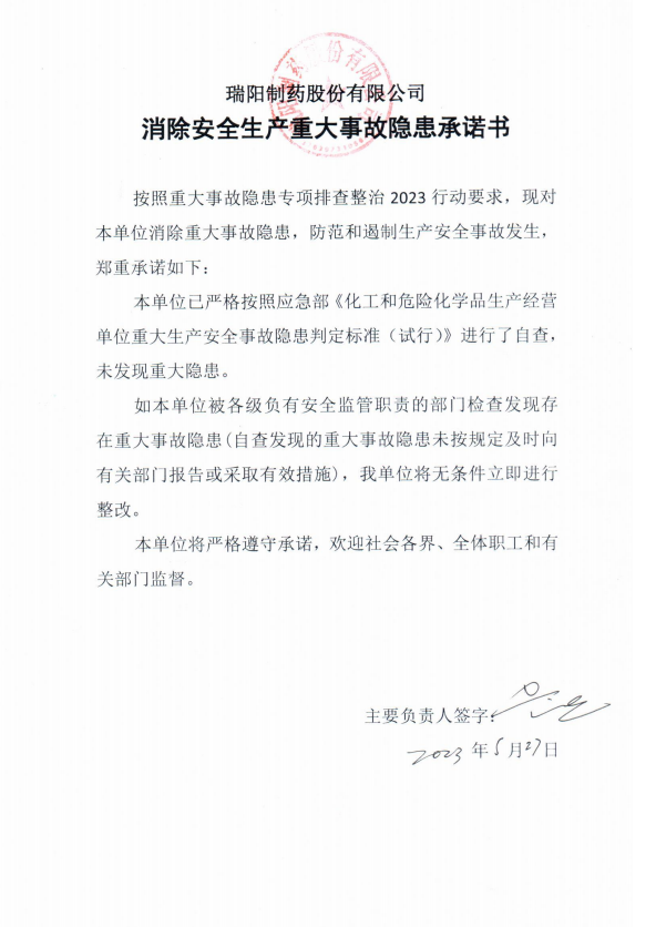 消除安全生產重大事故隱患承諾書